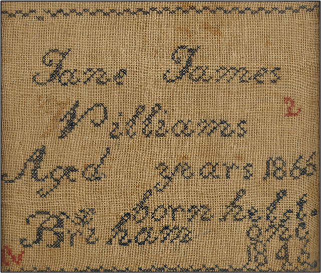 Most girls learned stitching between the ages of five and their early teen years, but Jane James Williams’ sampler was likely made when she was 20 years old, a very late age to be making samplers.